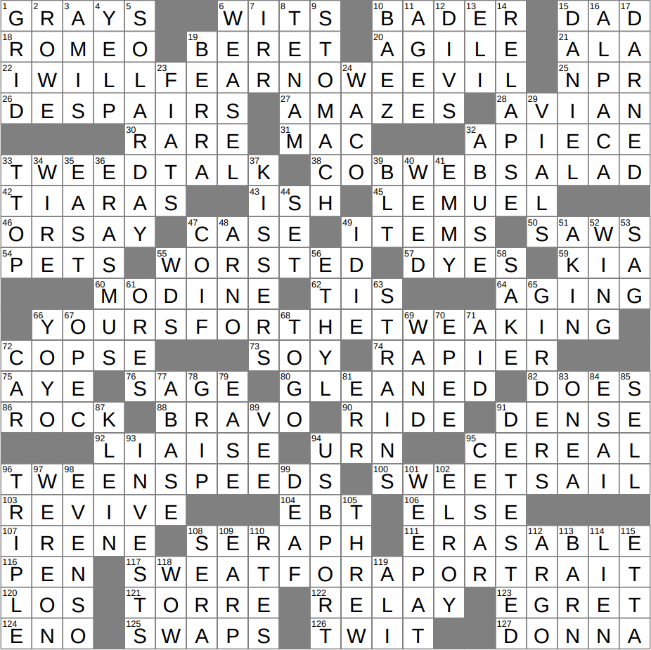 - 96A Data from a middle school track meet? : TWEEN SPEEDS (from “ten-speeds”)