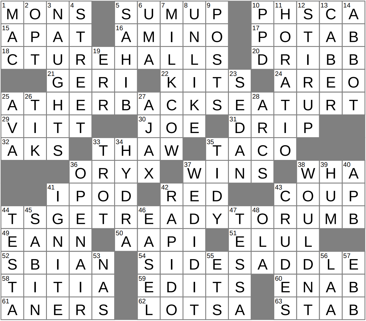 • 54A Equestrian style, or, when parsed differently, a three-part instruction for making 19 clues in this puzzle match their answers : SIDESADDLE, or, SIDES ADD “LE”