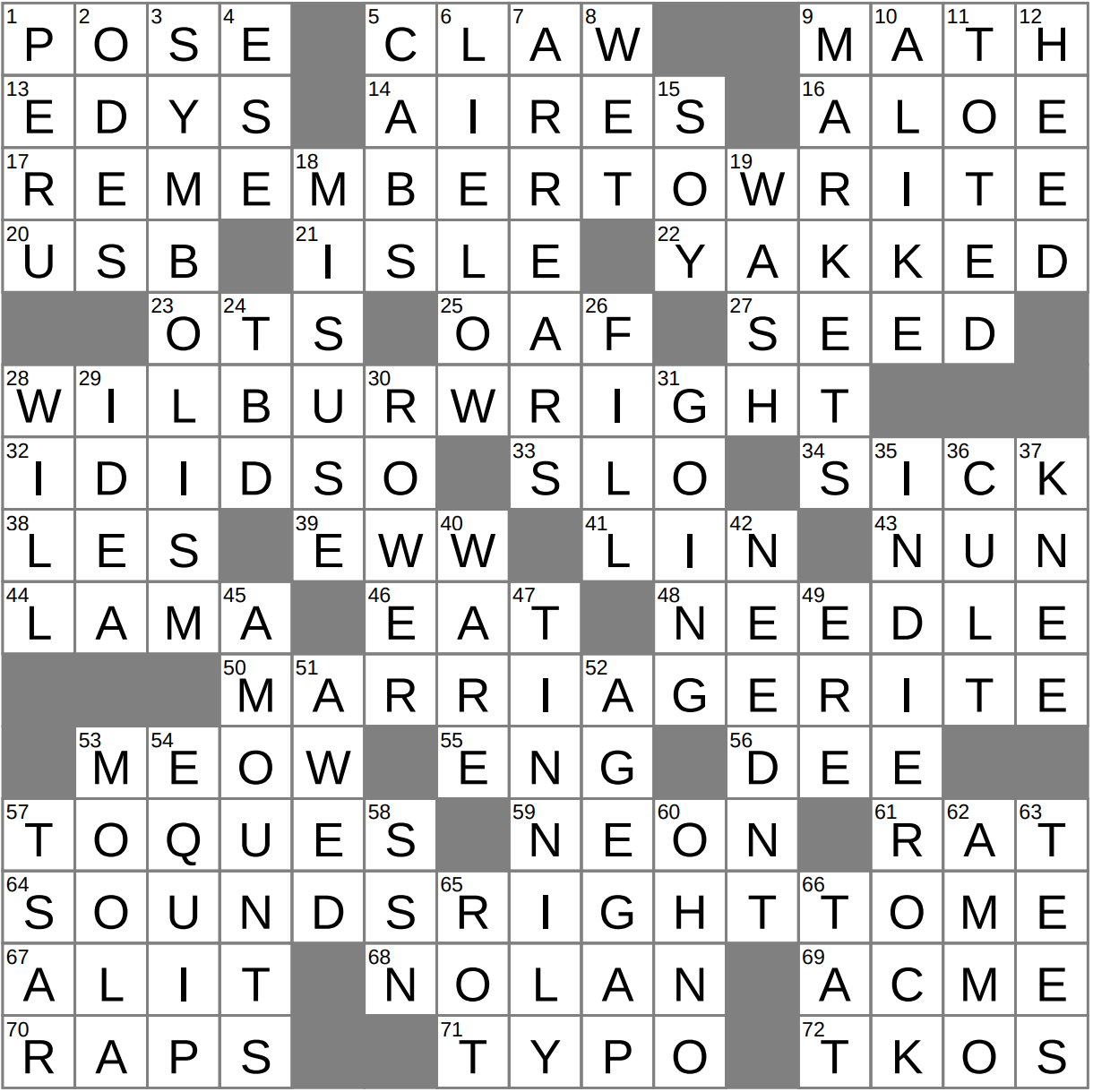 - 64A “I think that’s correct,” or what one may say about the ends of 17-, 28-, and 50-Across : SOUNDS RIGHT TO ME